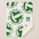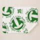 This sporty volleyball themed sherpa fleece blanket features 5 randomly arranged green and white volleyballs with the text, "The volleyball court is my happy place" in green encircling each volleyball in a fun typographic font, all on a white background - her name and jersey number are customisable - by katz_d_zynes