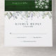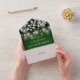A rustic all-in-one wedding invitation featuring pretty watercolor greenery foliage, string lights, mason jars and elegant modern typography on an emerald green wood panels background. The invitation includes a perforated RSVP card that can be individually addressed or left blank for you to handwrite your guest's address details. Designed by Thisisnotme©