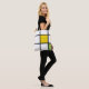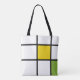 Freshen up your summer wardrobe with this Mondrian style tote bag featuring green and yellow geometric squares and bold black stripes. This design is minimalistic and modern, and it will complement a variety of summer outfits.