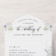 Elegant watercolor greenery and floral All-in-One Wedding invitation with perforated RSVP. Environmentally friendly as there is no need for extra insert cards, RSVP cards or even envelopes, this invitation has it all! Ability to add both Wedding Ceremony and Reception details, as well as RSVP postcard ready for guests to fill in and mail! Design with exquisite greenery and floral details in a beautiful blend of white, blue and green tones. RSVP back in dusty blue tone. Invitation with directions to website and RSVP with wide section for meal options. Same invitation with a different central and RSVP layout also available. Option to order invitations with printed (or hand write later) guest name on the back so you can mail it with no need of envelopes, or instead, add a personal message or quote if you prefer to send card with an envelope. Attractive design ideal for the elegant, yet practical and eco-friendly couple! Part of our "Elegant Bliss" collection with a variety of coordinating invitations, insert cards, mailing accessories, save the dates, thank you cards and event signs and products. Visit entire collection at: https://www.zazzle.com/collections/elegant_bliss_collection-119067295475874152