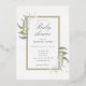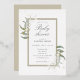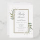 Elegant botanical greenery baby shower invitation featuring watercolor foliage and gold foil shimmer. Colours in sage dusty blue and beige tan.