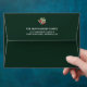 Dark green self addressed envelopes with your family name and address in classic white font with a bouquet of greenery and leaves.