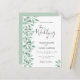 A trendy botanical wedding invitation in white and green. A chic white background on the front. Decorated with watercolored greenery, foliage, springs. Modern large handlettered script, typography with the text: The wedding of. Templates for names and wedding details. Dark grey text.