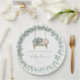 Elegant green gender neutral baby shower paper plates showcasing watercolor eucalyptus greenery leaves wreath and cute sleeping baby on the swings.