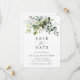 Invite friends and family in style and set the tone for your special day with this charming save the date card. Design features eucalyptus leaves and greenery on white background.
