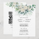 Greenery eucalyptus white roses wedding invitation template with QR RSVP code at the back.