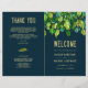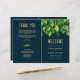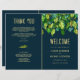 Creative wedding design featuring abundant foliage hand-drawn in a modern manner imitating metallic texture. Shades of green, gold, copper, platinum, turquoise, dark blue. Deep blue background. Gold lettering (gold is not real gold but colour). Modern streamlined fonts. Truly unique, involving, and elegant. For fall wedding, summer wedding, garden wedding, or any kind of modern elegant wedding.
