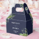 This elegant greenery botanical floral wedding favour box can be personalised with your information in chic typography on a navy blue background. Designed by Thisisnotme©