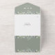 All in one wedding invitation featuring pretty watercolor greenery foliage and elegant modern typography on a sage green background. The invitation includes a perforated RSVP card that features your wedding website QR code. Designed by Thisisnotme©