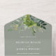 This all-in-one wedding invitation features botanical greenery falling across elegant typography on a sage green background. The invitation includes a perforated RSVP card with your wedding website QR code and details. Designed by Thisisnotme©