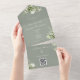 All in one wedding invitation featuring pretty watercolor greenery foliage and elegant modern typography on a sage green background. The invitation includes a perforated RSVP card featuring your wedding website QR code. Designed by Thisisnotme©