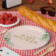 An elegant baby shower paper plate featuring chic gold typography and pretty botanical greenery foliage on a blush pink background. Designed by Thisisnotme©