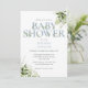 An elegant baby shower invitation featuring elegant dusty blue typography and pretty botanical greenery foliage and your special photo on the reverse. Designed by Thisisnotme©