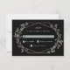 This trendy and elegant wedding response card features a faux rose gold geometric shape surrounded by beautiful greenery branches, on a dark, black background.