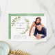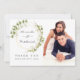 Trendy sage green and white watercolor leaves wedding thank you photo cards with gold geometric frame.