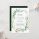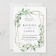 Beautiful watercolor forest foliage adorned on a golden geometric frame, wedding invitation. Elegant typography design style template. Back of card, shown in solid green, can be customised.