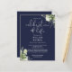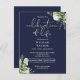 An elegant navy blue, botanical personalized watercolor greenery celebration of life remembrance invitation postcard. Designed by Thisisnotme©