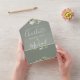 All in one wedding invitation with pretty greenery floral, signature style names and chic typography on a sage green background. The invitation includes a perforated RSVP card featuring your wedding website QR code. Designed by Thisisnotme©