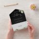 All in one elegant black and white wedding invitation featuring greenery leaves, chic hearts script typography, and monogram initials. The invitation includes a perforated RSVP card that can be individually addressed or left blank for you to handwrite your guest's address details. Designed by Thisisnotme©