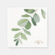 Eucalyptus Stem Greenery Wedding Cocktail Napkins. White Background. Gold Monogram.