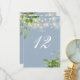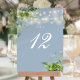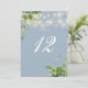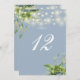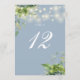 These elegant botanical greenery floral string lights wedding table numbers can be personalised in chic typography on a dusty blue background. The cards are printed on the front and back (double-sided). Designed by Thisisnotme©