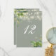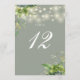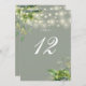 These elegant botanical greenery floral string lights wedding table numbers can be personalised in chic typography on a sage green background. The cards are printed on the front and back (double-sided). Designed by Thisisnotme©