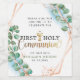 Modern watercolor greenery and gold frame First Communion sparkling wine Labels. Design featuring watercolor green leaves and gold frame. Personalise with your child's name and 1st Communion date.