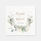 Elegant napkins for your wedding parties and reception featuring watercolors of sage green eucalyptus greenery, laurel leaves with gold accents, your names in a stylish gold script and your wedding date in modern soft grey typography.