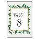 Greenery Watercolor Botanical Wedding Table Number Cards - features a printed white watercolor paper texture background with watercolor greenery surrounding a gold trimmed text box. Each leaf features various shades of green watercolor for a unique look.