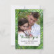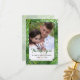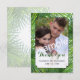An elegant keepsake small custom wedding thank you card printed with a photo from your wedding and personalised with your names in green modern script and the wedding date. The thank you note is decorated with a frame of green tropical foliage and on the back there is a space for a personal, hand written greeting.