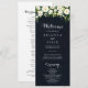 This greenery white floral royal blue wedding program is perfect for a rustic wedding. The design features elegant watercolor white peonies with green foliage in a dark blue background.