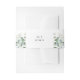Greenery wedding invitation belly bands. Featuring leafy greenery foliage eucalyptus leaves, on a clean white background. With customisable monogram and wedding date feature.