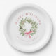 Watercolor Greenery Wreath & Red Coquette Bow Happy Holidays Party Paper Plate. Personalize with your headline and name.