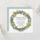 This beautiful wedding invitation features a wreath of lush greenery in bright olive green and dark teal. The backside is a coordinating light dusty teal colour.