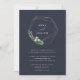 Our Greenhouse wedding invitation features your names encircled by a modern geometric wreath of faux copper foil wires, green botanical foliage, leaves, and tiny white flowers. Personalise this modern and elegant botanical wedding invitation with your wedding details beneath in chic white lettering on a striking navy blue background.