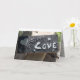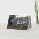 greeting card, everyday/love/appreciation ....outside has a lino-block carving of the word "love" and a heart - inside: in Spanish: "Cada dia te quiero mas que ayer y menos que manana" ("I love you more than yesterday, but not as much as tomorrow)...inside: light grey with a lace background