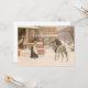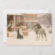 Greeting the Postman by Robert Walker Macbeth (1848-1910) is a vintage Victorian fine art portrait painting. A woman is reaching for the mail delivered by the postman riding a horse. The mailman is delivering Christmas letters to the lady of the house during a snowstorm in winter.