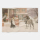 Greeting the Postman by Robert Walker Macbeth (1848-1910) is a vintage Victorian fine art portrait painting. A woman is reaching for the mail delivered by the postman riding a horse. The mailman is delivering Christmas letters to the lady of the house during a snowstorm in winter.