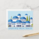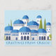 A digital illustration of a Greek village with white buildings and blue roofs make up this vintage style postcard.