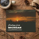 Share the beauty of Michigan with our stunning Greetings from Michigan Postcard. Featuring a breathtaking sunset scene, this postcard is printed on high-quality paper with a bright white, semi-gloss finish. With a thickness of 12.5 pt and a weight of 110 lb, it provides a sturdy and premium feel. Made from 50% recycled content, the paper is imported from Italy and printed in the USA. Perfect for sending a little piece of Michigan to friends and family or for adding to your postcard collection.