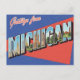 This beautiful postcard features a classic "Greetings from Michigan" large letter design with a nostalgic, retro feel. Each letter of "MICHIGAN" is filled with a unique scene from the Great Lakes State, showcasing iconic landmarks like the majestic Mackinac Bridge, the stunning shoreline of Pictured Rocks National Lakeshore, and the immense Sleeping Bear Dunes. The vintage colour palette and striped background add to its old-fashioned charm, making it a perfect keepsake or a thoughtful note to send to friends and family. Ideal for travelers, postcard collectors, or anyone who loves the natural beauty and vibrant spirit of Michigan.