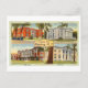 This postcard is a reproduction of a vintage travel postcard showing four scenes from Plattsburg, New York, including the school, library, city hall, and post office.