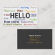 A white background with the greeting "Hello" in the centre of the card, it is surrounded by "greetings" in different languages, all greetings are in different colours and fonts.