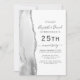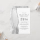 The left-hand edge of this elegant modern wedding anniversary party invitation features a grey and white watercolor agate border trimmed with silver faux glitter. The customisable text combines charcoal grey handwriting, copperplate and italic fonts on a white background. The reverse side features a matching grey and silver agate design.