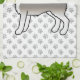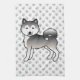 Destei's original cartoon illustration of a grey coat colour Alaskan Malamute breed dog. The background has a pattern of grey dog paw prints.