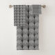 This towel set has an art deco design of black fans repeating across the design on a field of grey.