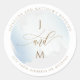 Elegant grey, taupe and blue watercolor brush strokes wedding sticker, great for envelope seal of favour label. Ability to add any message you like on top and bottom outer rim, great for couple's names and address for envelope seal, or for thank you message and date for favours. Centre with couple's initials with "and" in graceful modern hand written calligraphy. Note: typography is not in real foil, but rather print in a golden hue. Part of our "Blue with Blush or Grey Brush Strokes Wedding" collection.