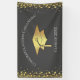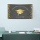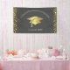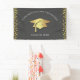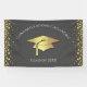 This modern design features a graduation hat and confetti in gold on a background of grey with white text.