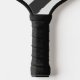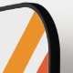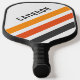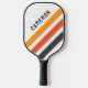 Pickleball paddle featuring three diagonal stripes in dark grey and two shades of orange on a white background and your custom name in a bold, modern sans serif font.