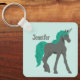 Features a unicorn illustration in a realistic style. The unicorn is a dark charcoal grey with a teal green mane and tail. There’s a spot to add a name or other text in grey lettering. The text and graphic appear on both sides of this keychain.